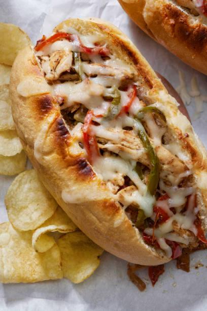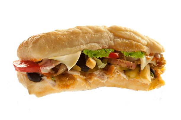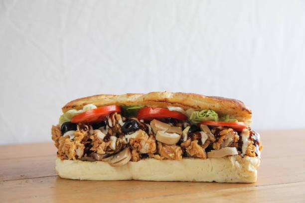 Sandwichs classiques : thon, poulet ou dinde fumée, garnis de fromage, salade, tomates et sauce maison sur baguette parisienne.